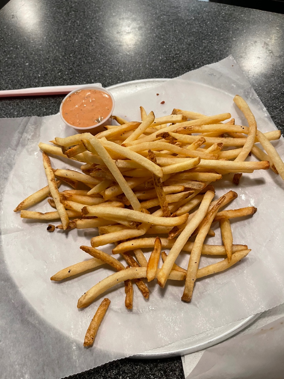 사이드로 시킨, 베이컨 치즈감자튀김과 그냥 감자튀김이랍니다. 위에 보이는 소스가 매력 있었어요. ㅎㅎ